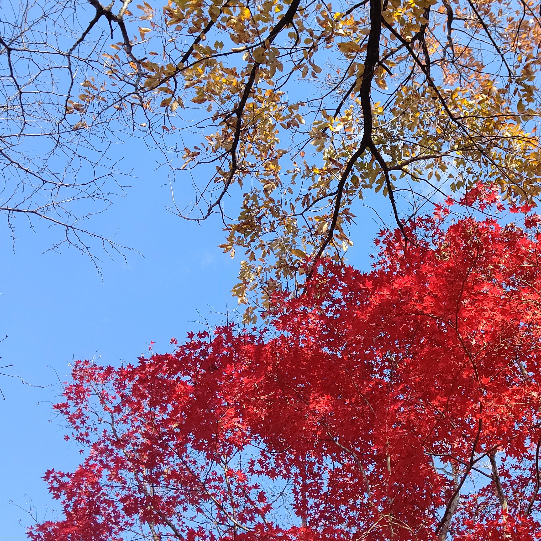写真は思わずその美しさにみとれた、小布施の紅葉です。見上げた空の青と紅葉の赤。今この瞬間の美しさ。