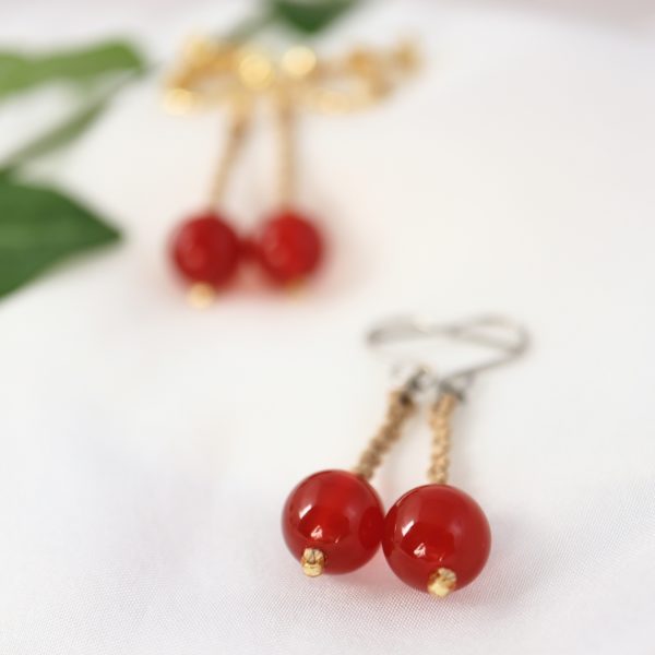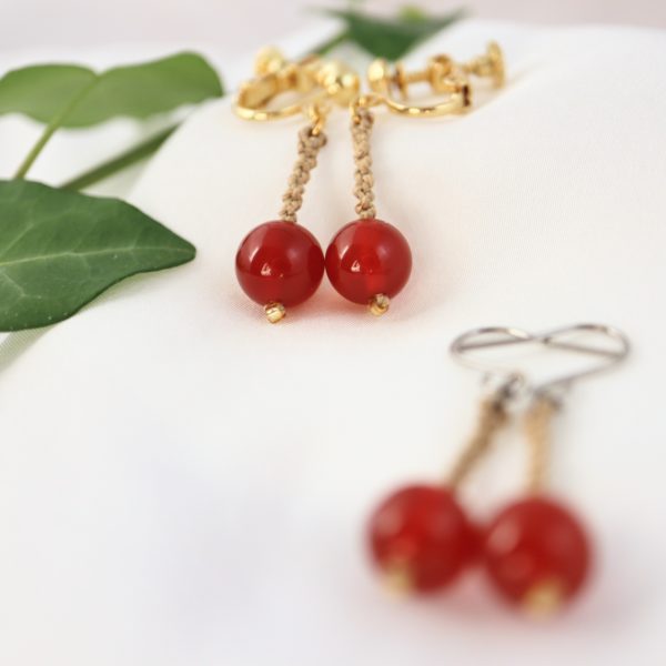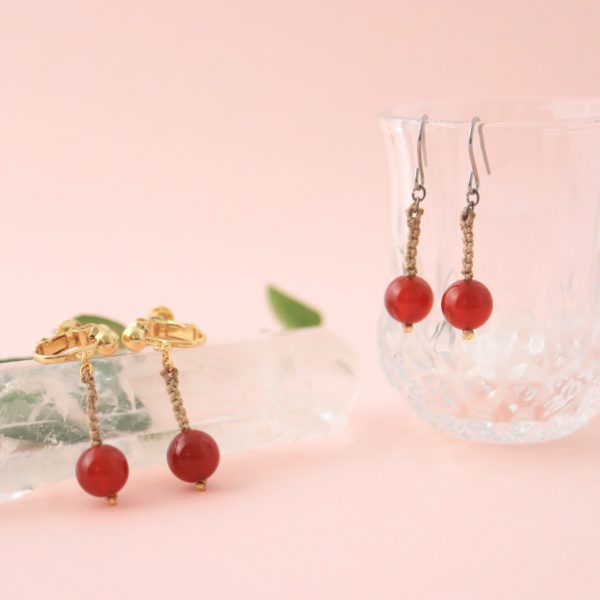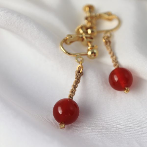 温もりを感じる赤色が印象的な天然石に、ゴールド色の絹糸を組み合わせ、マクラメ編みで制作いたしました。