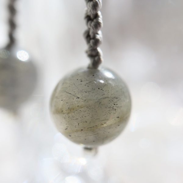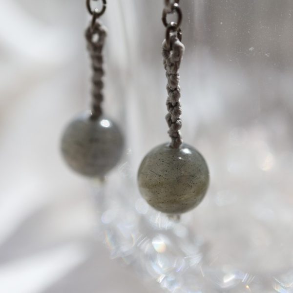 シックなグレーカラーに青い艶めきが美しい天然石に、ライトシルバー色の絹糸を組み合わせ、マクラメ編みで制作いたしました。