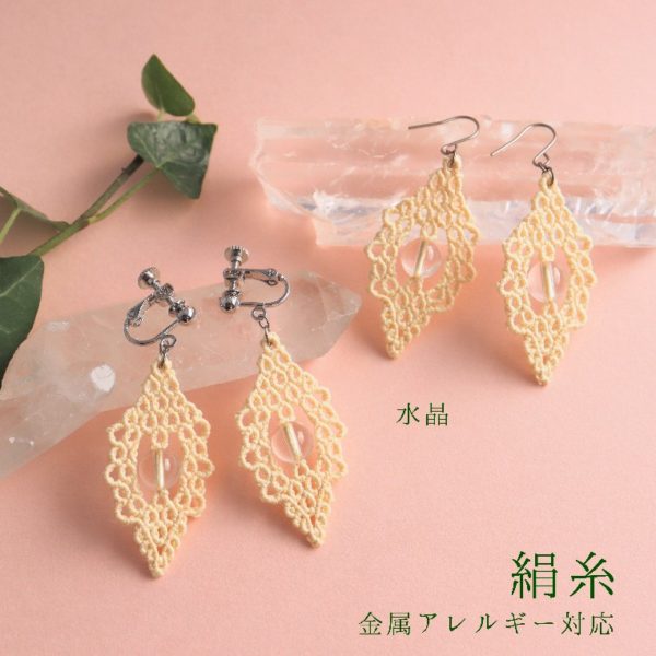 お肌に優しい絹糸、金属アレルギー対応の耳飾りはストレスフリー。ナチュラルなライフスタイルを愛する花嫁様へのウェディングアクセサリーとしてもおすすめいたします。