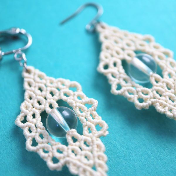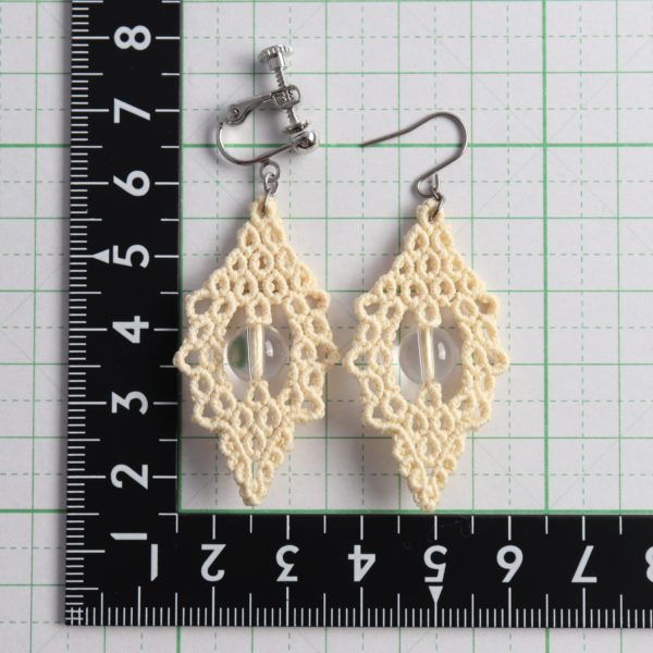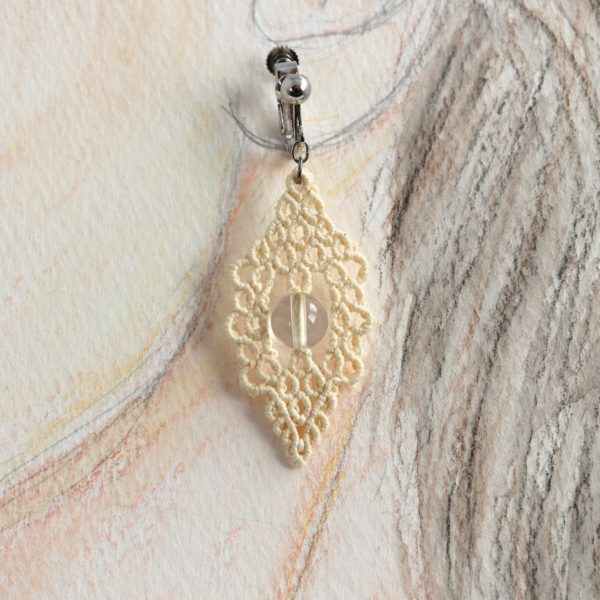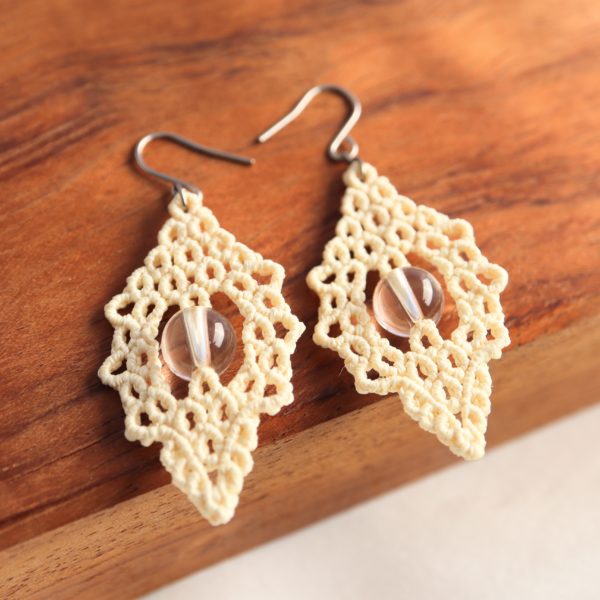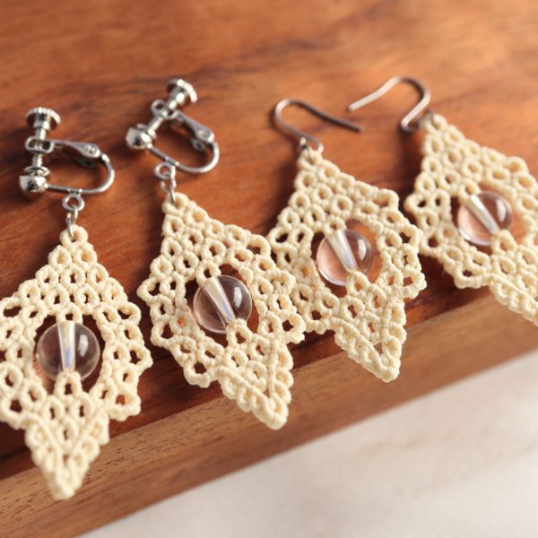 繊細なレースのようなモチーフの中心に透明な天然石を配置し、柔らかな印象のクリーム色の絹糸を合わせ、マクラメ編みで制作いたしました。
