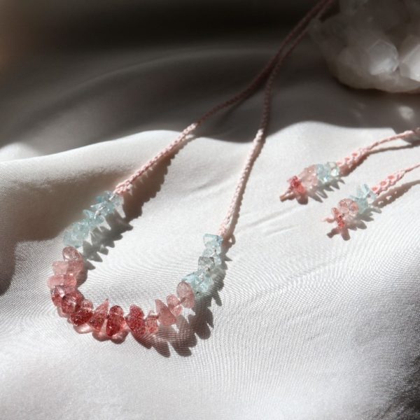 天然石のお色味が引き立つように桜色の絹糸を合わせ、マクラメ編みで制作いたしました。
