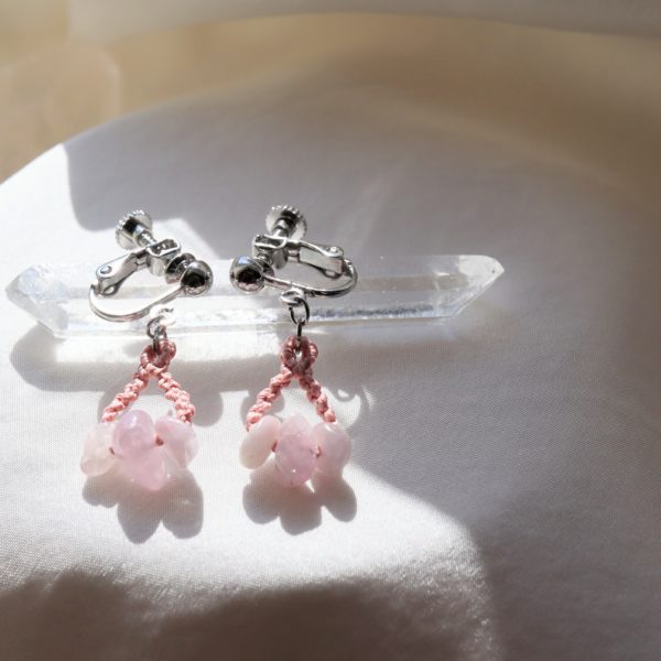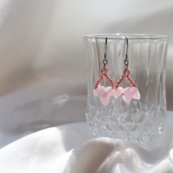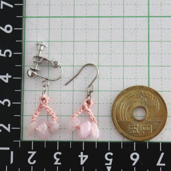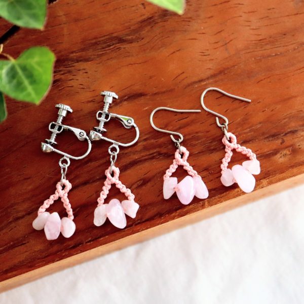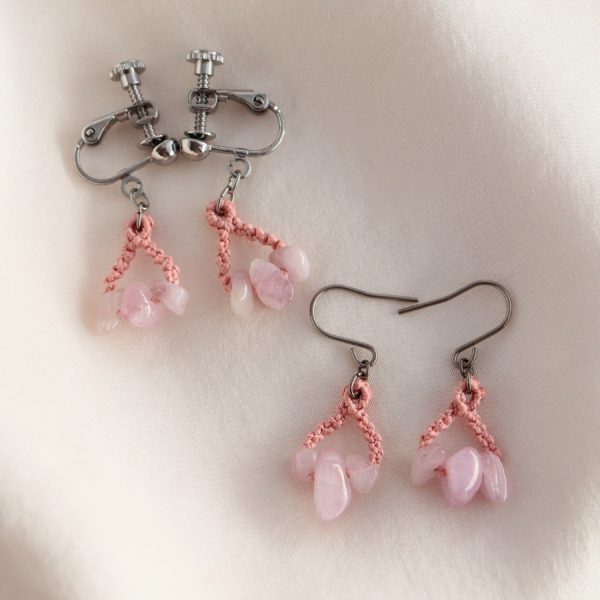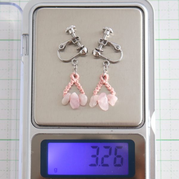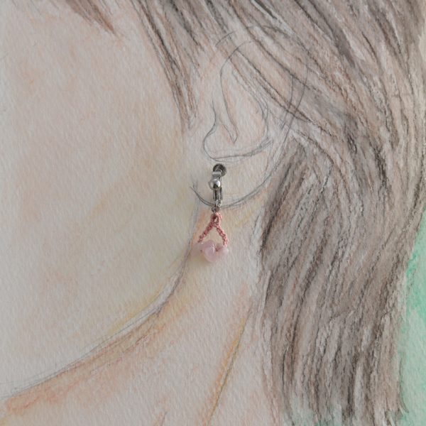 青みのあるピンク色の天然石に撫子色の絹糸を合わせ、マクラメ編みで制作いたしております。